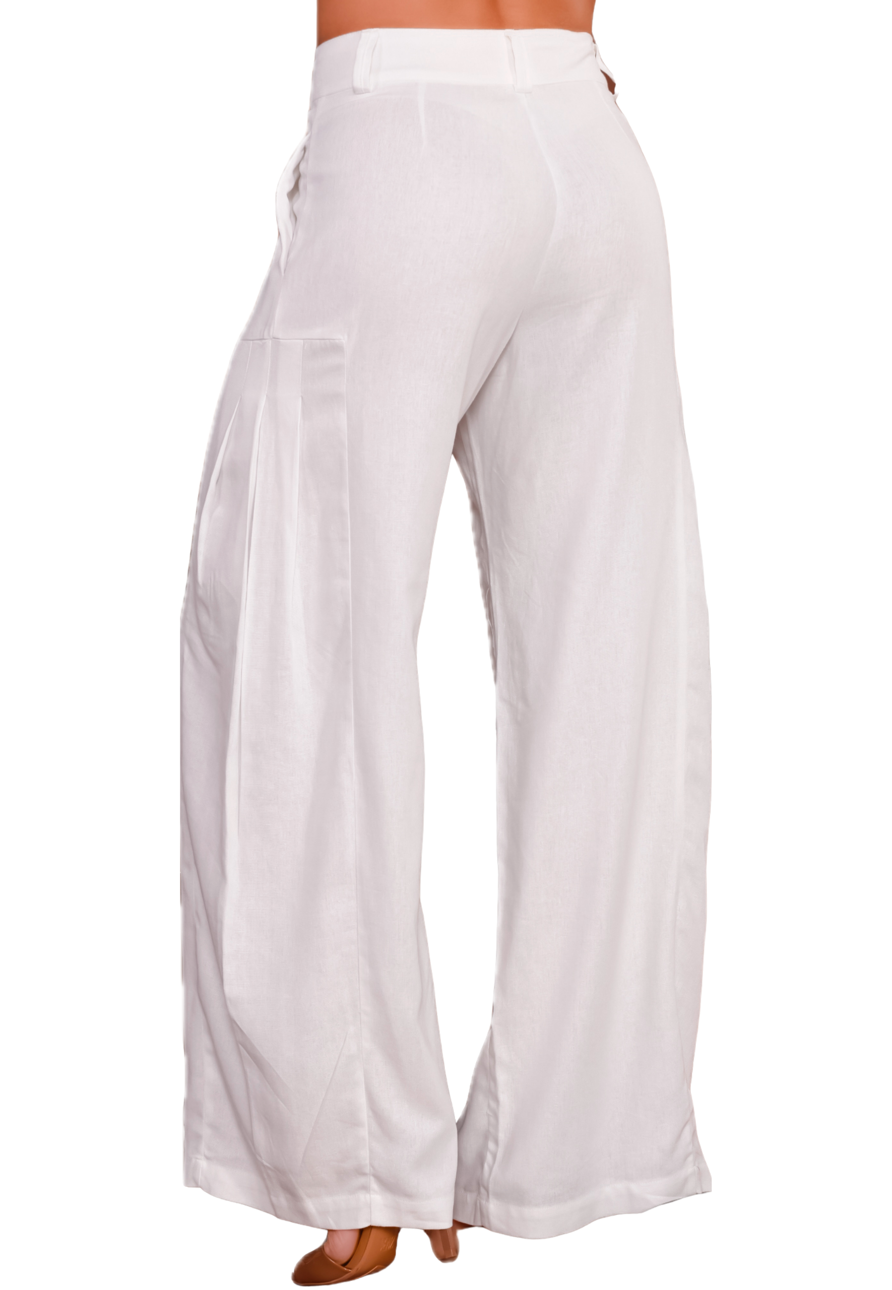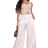 Perfecto para un look elegante y fresco al combinarlo con crop tops o bralettes ajustados, blusas fluidas fajadas, y tacones o sandalias de plataforma para acentuar la longitud de la pierna y la caída del pantalón.
