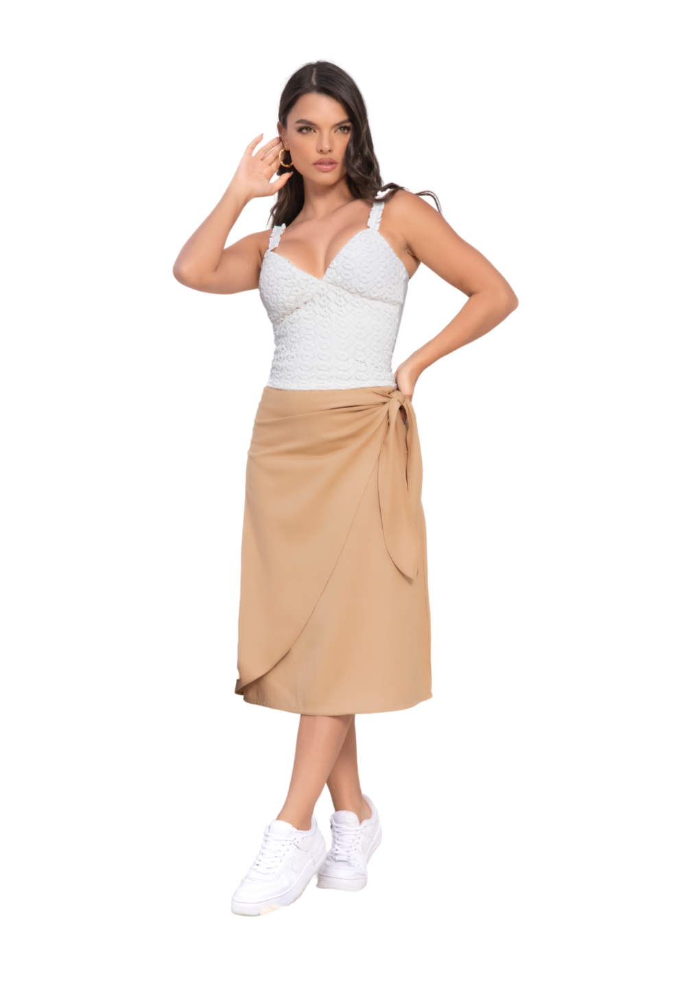 Blusa diseñada en encaje que aporta textura y feminidad. Su silueta favorecedora y el sutil cruce en la parte frontal realzan naturalmente la figura, mientras que los tirantes con detalles rizados añaden un toque moderno y encantador. Es una prenda versátil que combina elegancia y frescura, ideal para elevar cualquier look sin esfuerzo.