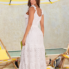 Un vestido largo que combina romanticismo y frescura en cada detalle. Su diseño en tela bordada con delicados calados, tirantes con volantes y escote sutil con lazo decorativo aportan un aire femenino y sofisticado. La silueta amplia con caída fluida estiliza la figura y brinda movimiento, convirtiéndolo en una pieza ideal para destacar con elegancia.