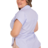 Esta es una blusa de estilo camisero clásico con un corte que se ajusta sutilmente al torso. Presenta un patrón de rayas verticales finas que le otorgan un aspecto pulido y estilizado. Tiene un cuello de solapa tradicional y una abotonadura frontal completa y visible. Las mangas son cortas, con un dobladillo recogido que le da un toque relajado y casual. El bajo de la blusa tiene una forma redondeada (corte tipo camisa), diseñada para llevarse por dentro de la cintura o por fuera sobre la cadera. La tela parece ser ligera y fresca, ideal para climas cálidos