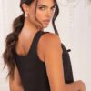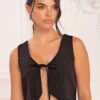 - Lazo para amarre delantero: Detalle funcional y decorativo que permite ajustar el chaleco al cuerpo, realzando la silueta con un estilo elegante.