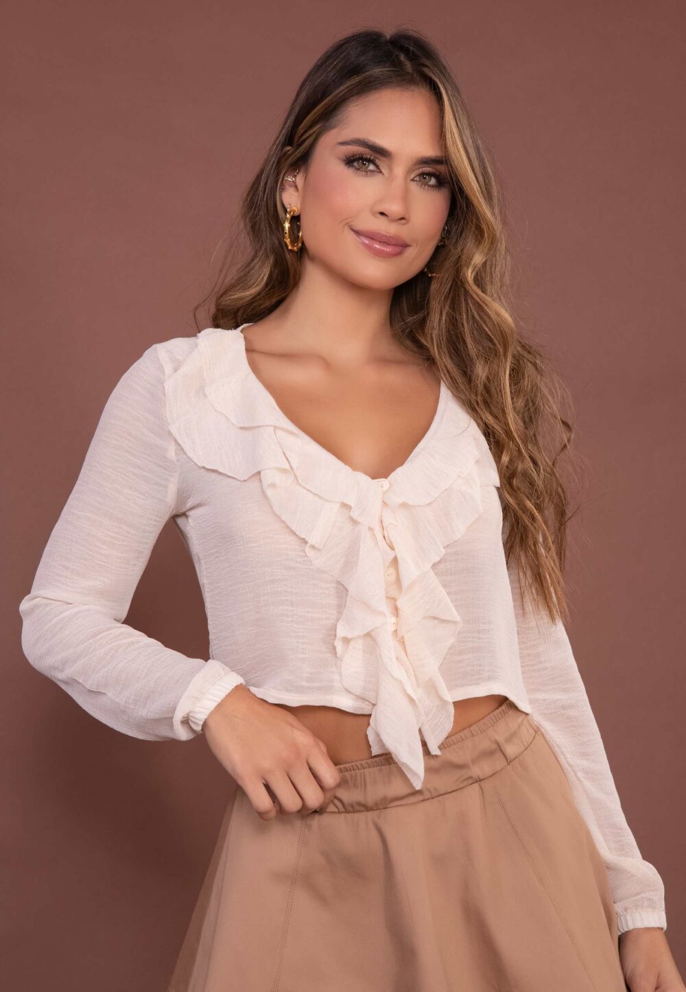 Luce femenina y sofisticada con esta blusa elaborada en chifón suave y liviano. Su diseño destaca por el bolero central que aporta movimiento y un aire romántico, acompañado por una delicada perilla en el cuello que realza su encanto. Una prenda versátil y elegante, perfecta para climas cálidos o para dar un toque especial a tus looks del día a la noche.