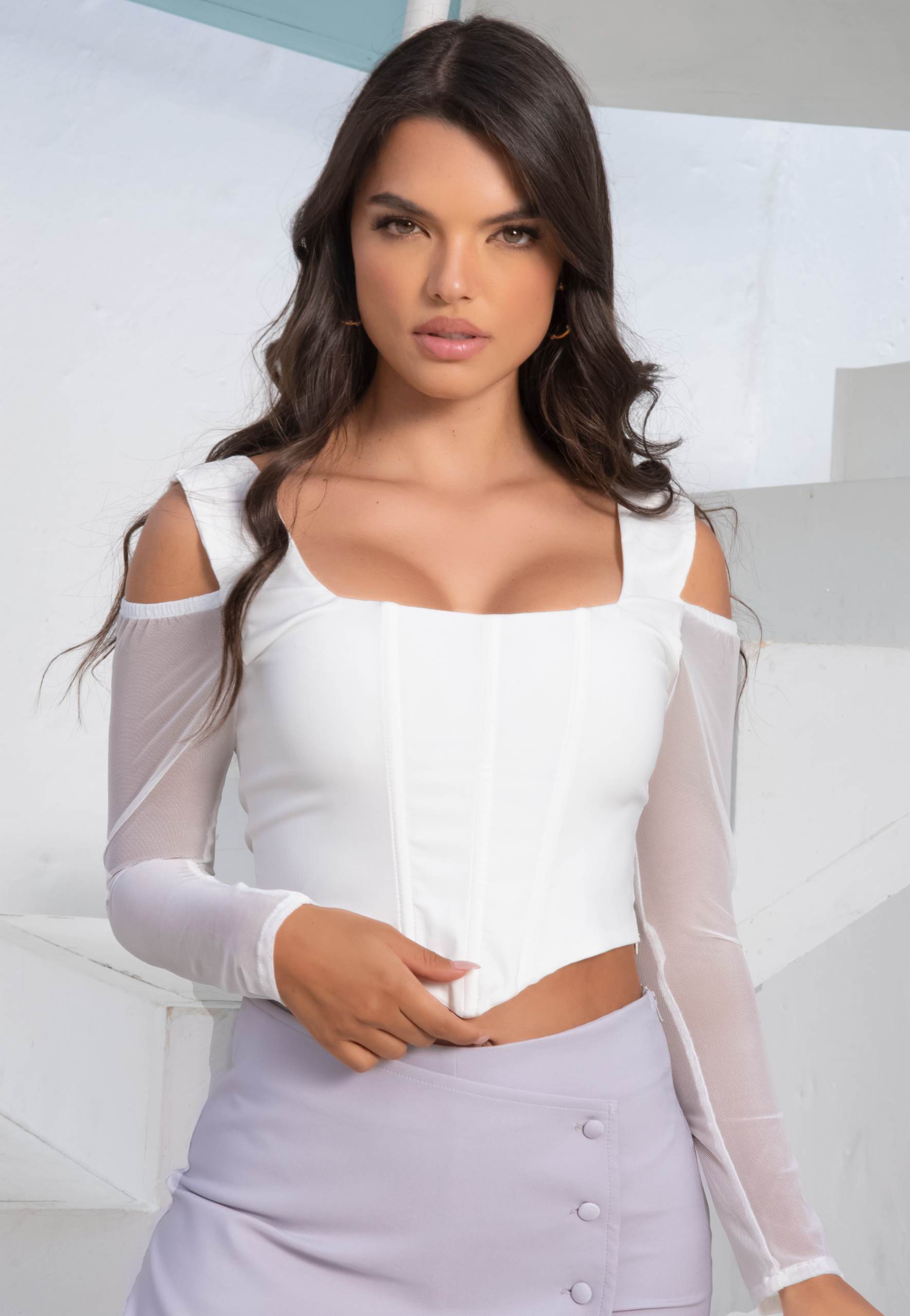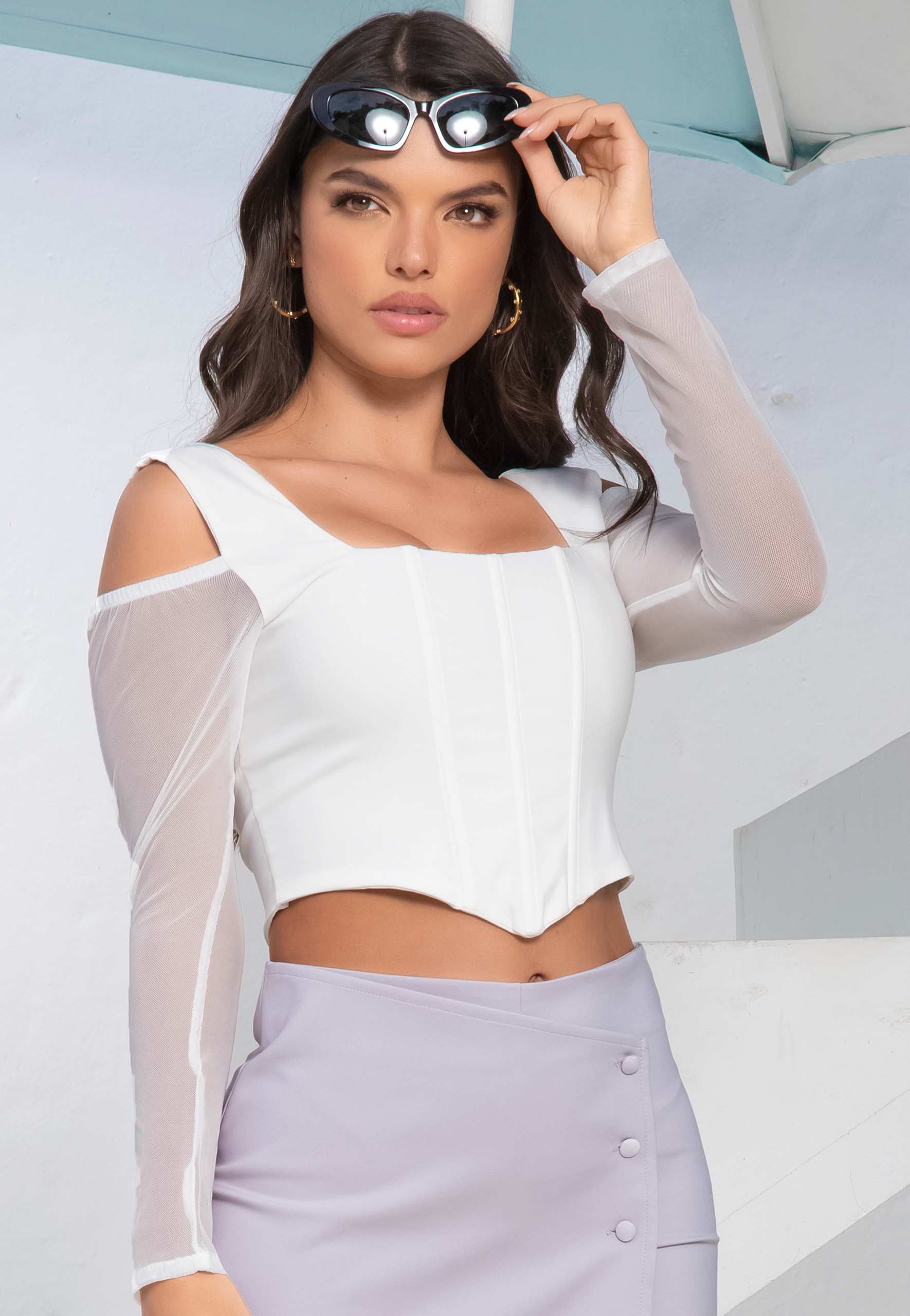 ¡Luce hermosa con esta blusa blanca de escote cuadrado y mangas elaborada en mallatex!