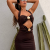 Este vestido corto ajustado y drapeado, elaborado en tejido elástico de alta calidad, está diseñado para adaptarse a tu cuerpo y resaltar tus curvas con total comodidad. Sus herrajes dorados en forma de concha, un detalle elegante y tendencia, elevan el diseño y lo convierten en una pieza llamativa, femenina y perfecta para las amantes del estilo moderno.