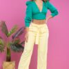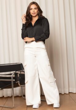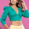 Esta hermosa blusa semi corta es una pieza sofisticada que eleva cualquier look. Su diseño con mangas largas bombachas añade volumen y movimiento, mientras que el acabado satinado aporta un brillo sutil y elegante.