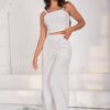 Este conjunto incluye una blusa de tiras con un delicado detalle de alforzas en la parte delantera, que aporta textura y sofisticación.