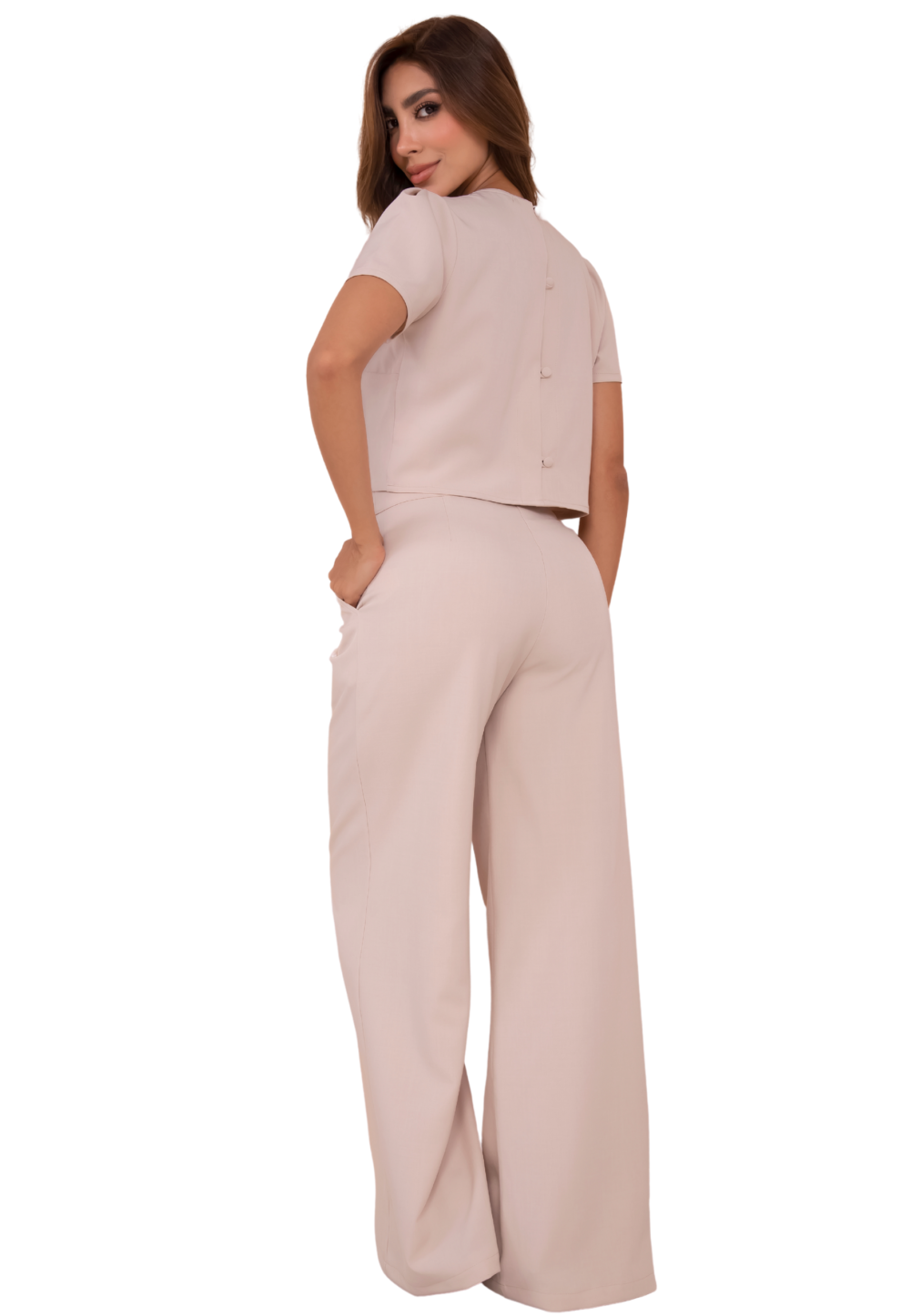 El pantalón, tipo sastre con bota palazzo, estiliza la figura y aporta una caída impecable. Está elaborado en una tela fresca, que no arruga, no transparenta y no marca, ideal para sentirte cómoda y lucir perfecta todo el día.