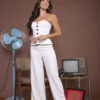 El pantalón de corte recto complementa perfectamente la parte superior, con pinzas estratégicas en la cintura que permiten un ajuste impecable y resaltan las caderas de forma sutil y muy femenina.