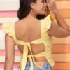 Esta hermosa blusa destaca por su diseño delicado y lleno de encanto. Los boleros en la sisa le dan un aire romántico y femenino, mientras que el escote con tiras en la espalda añade un toque moderno y sutilmente sensual. Confeccionada en una tela ligera, fresca y cómoda, es ideal para los días cálidos y para crear looks versátiles que van desde lo casual hasta lo más chic. ¡Una prenda que resalta tu estilo con suavidad y elegancia!